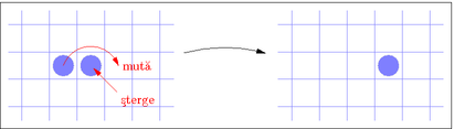 In centrul patratelelor de pe o foaie de matematica sunt asezate un numar de piese. O mutare consta in a "sari" cu o piesa peste alta piesa adiacenta in casuta GOALA de "dupa" piesa adiacenta, fapt ilustrat in figura urmatoare: