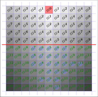 Presupunem ca toate piesele sunt asezate dedesubtul liniei rosii din figura de mai jos. De exemplu, in configuratia din figura, efectuand cateva mutari, este posibil sa ajungem cu o piesa in casuta verde. Aratati ca, indiferent cate piese asejam si indiferent de pozitia acestora DEDESUBTUL liniei rosii, este imposibil sa ajungem cu o piesa in casuta rosie. N.B. Foaia de matematica este presupusa de marima arbitrar de mare.